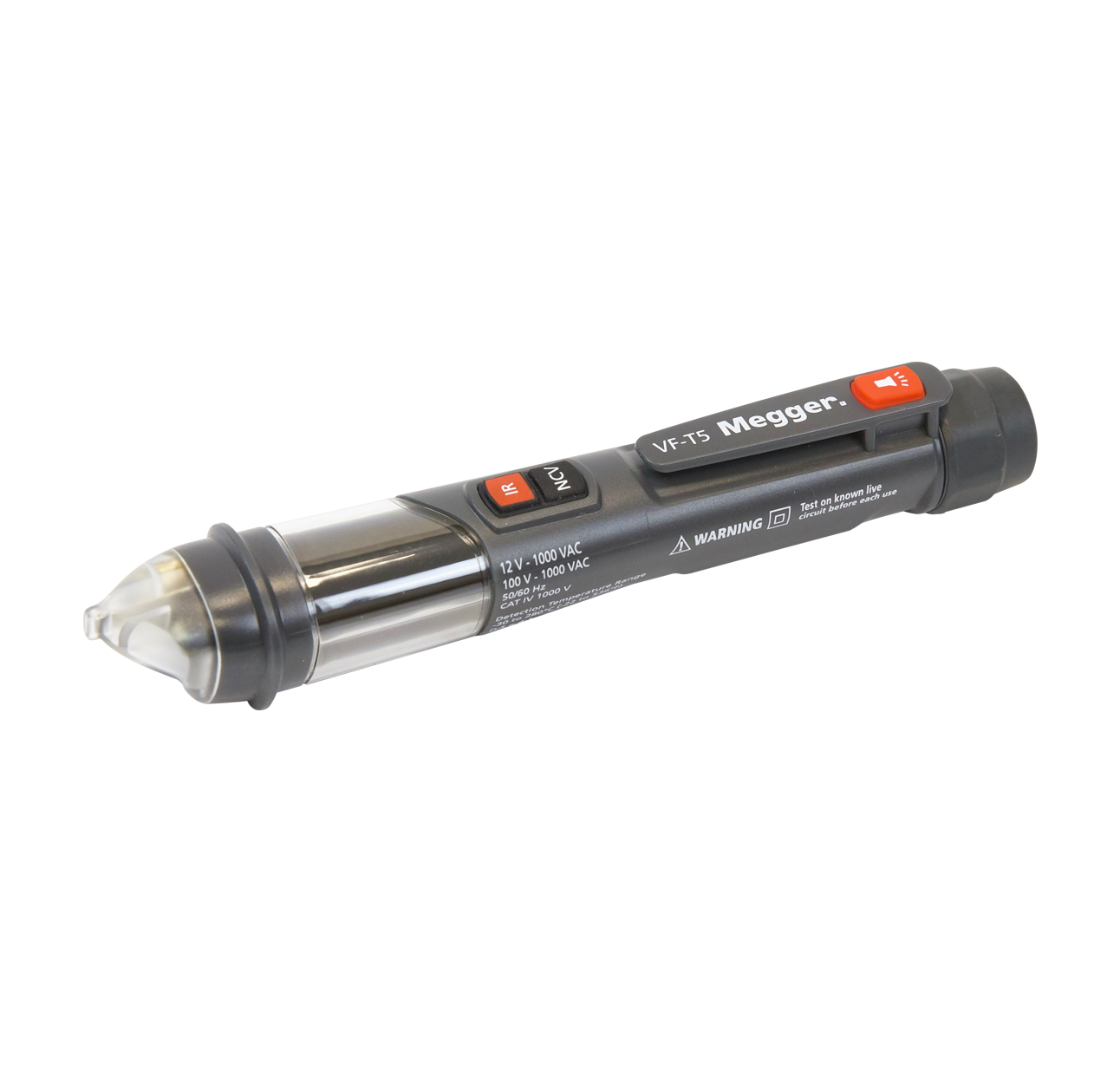 Megger VF-T5, dahili IR sıcaklık ölçümü özelliğine sahip, Megger'in ilk temassız voltaj dedektörüdür. Beyaz naylon uç içinde bulunan parlak kırmızı bir LED, sesli uyarıcı ve titreşimli uyarı ile AC voltajının varlığını kontrol etmek üzere tasarlanmıştır. Dedektör hem düşük voltaj (12 V ila 1000 V) hem de orta voltaj (100 V ila 1000 V) aralıklarına sahiptir. VF-T5, düşük ışık koşullarında kullanım için parlak beyaz bir LED el feneri avantajına da sahiptir.